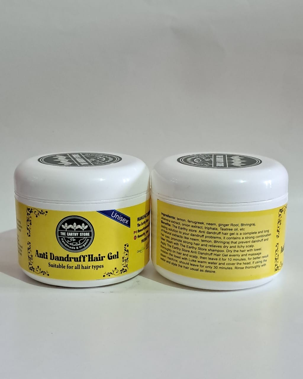 - The Earthy store Anti dandruff hair gel is a complete and long-lasting solution to your dandruff problems, it contains a strong combination of Natural extracts like Neem ,lemon, Bhringraj that prevent dandruff and hair loss, Promote stronghold and relieves dry and itchy scalp,