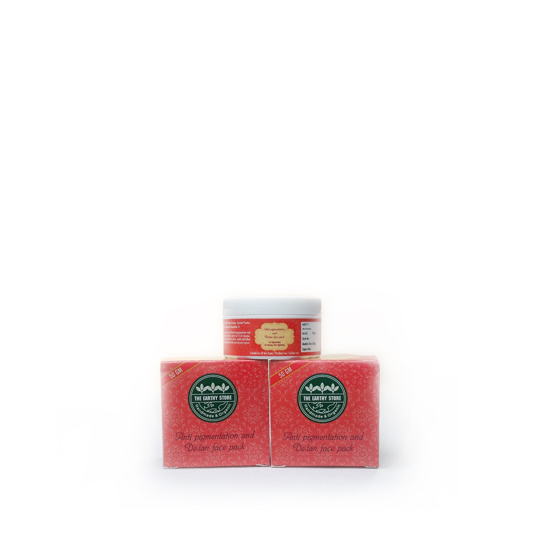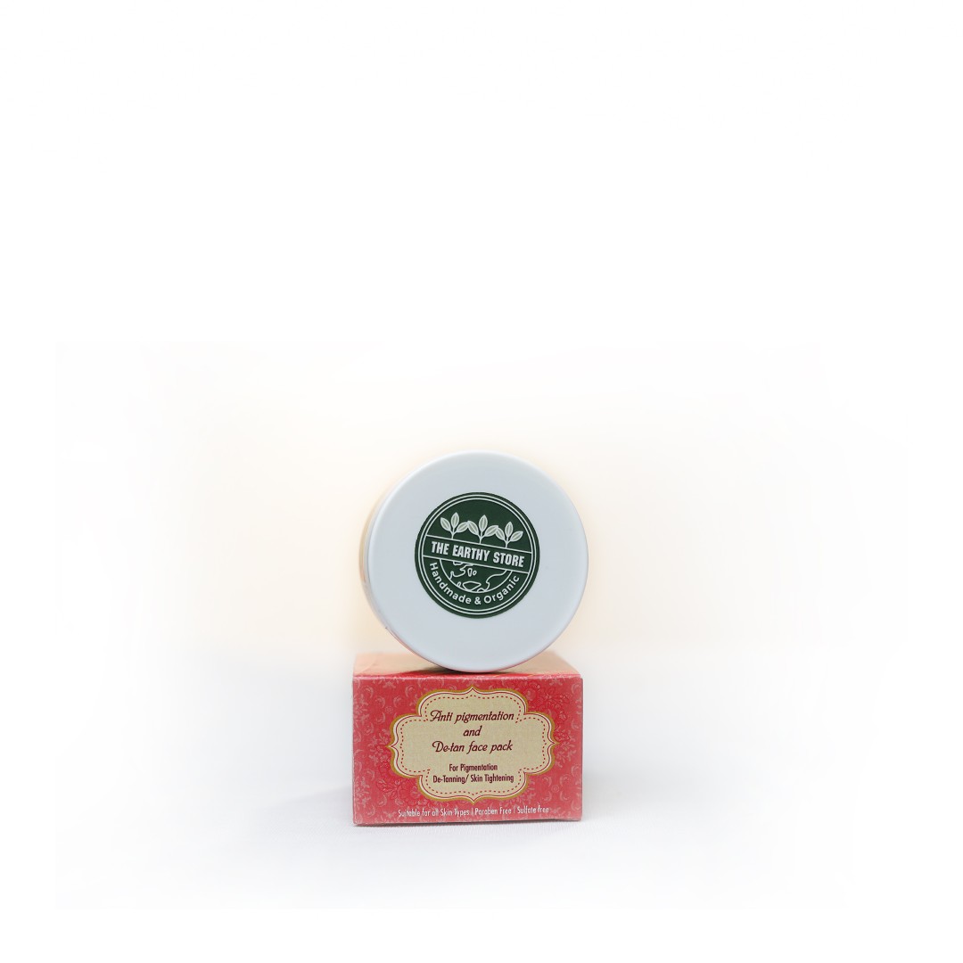 - The Earthy store Anti pigmentation and De-tan face pack is the perfect remedy for blemishes and dark spots, Reduces pigmentation, dark spots and blemishes provides an even tone and radiant skin ,it naturally removes tan from the upper layer of skin and gives you a Fairer, spot free look.